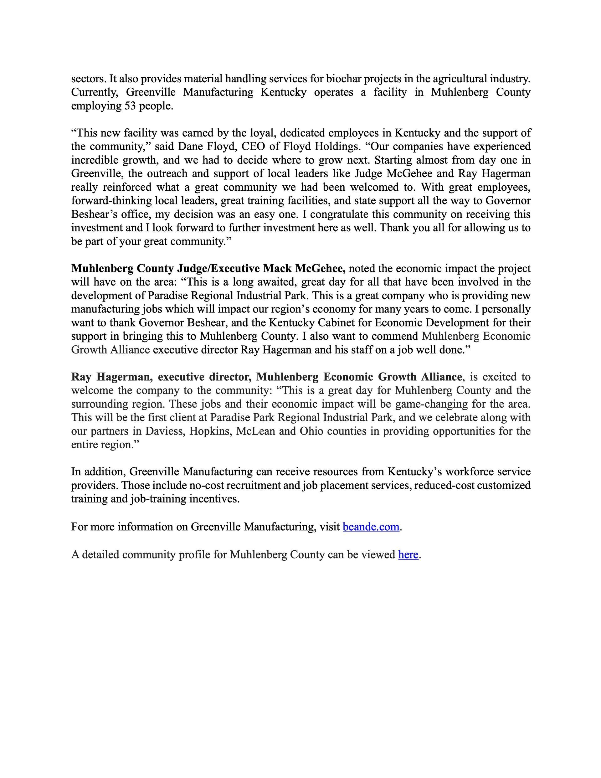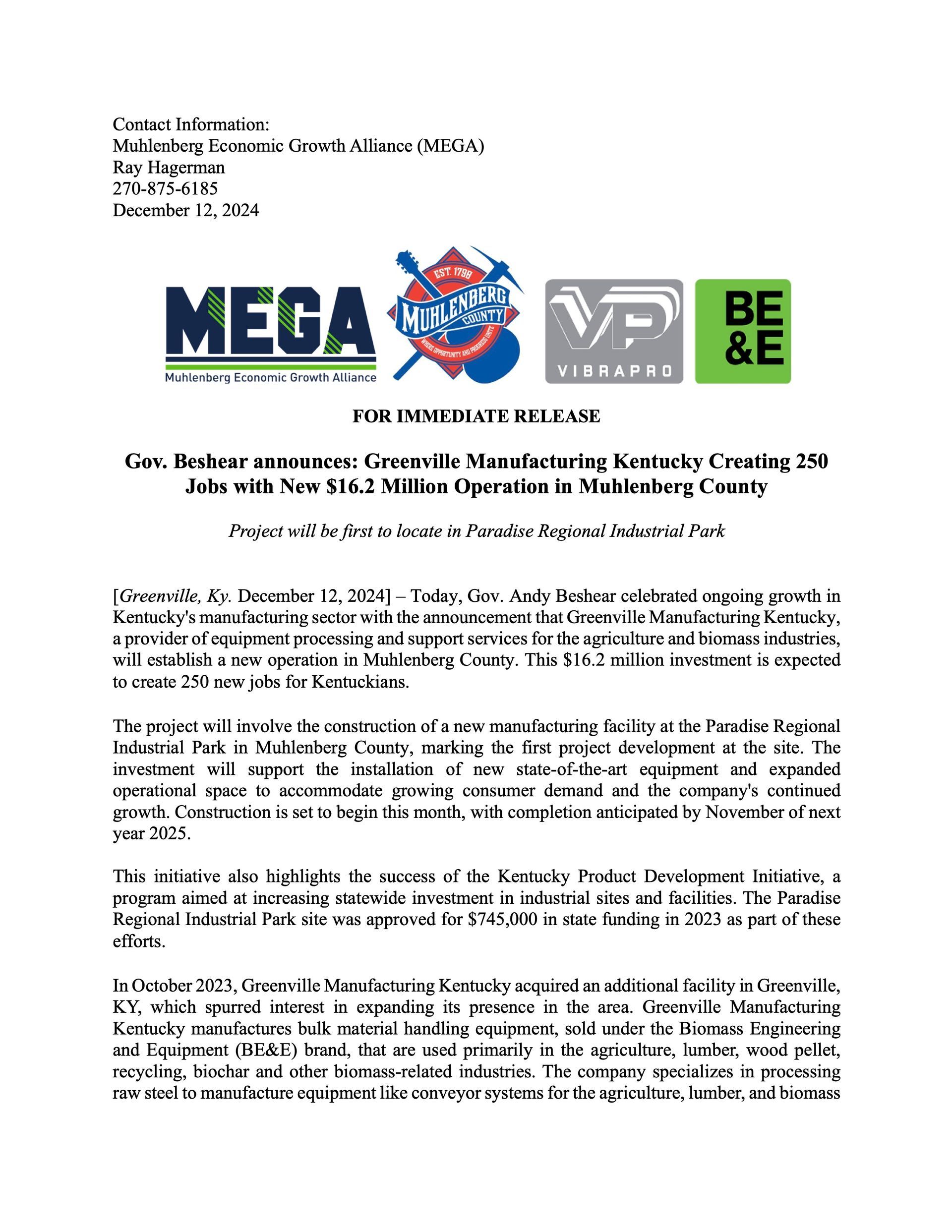 Greenville Manufacturing Kentucky Creating 250 Jobs with New $16.2 Million Operation in Muhlenberg County
